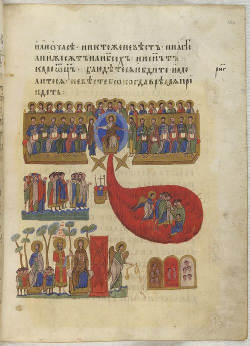 Dal trono del Signore scende il fiume. Come si canta nel stychyra (canto liturgico): "Quando verrai per fare un giusto giudizio, Giudice Giusto, seduto sul trono della tua gloria, e un terribile fiume di fuoco porterà tutti davanti al tuo giudizio, per giudicare le persone con timore davanti ai cori celesti, perché quanto hanno fatto tutti, allora Cristo, abbi pietà di noi, e consideraci buoni tra coloro che saranno salvati, Te ne supplichiamo". Nel libro della profeta Isaia si dice: "Il Signore verrà nel fuoco, ei suoi carri come un turbine" (Is 66, 15). Daniele vede così questa venuta: "Un fiume di fuoco scendeva dinanzi a lui, mille migliaia lo servivano e diecimila miriadi lo assistevano. La corte sedette e i libri furono aperti" (Dan 7, 10).
