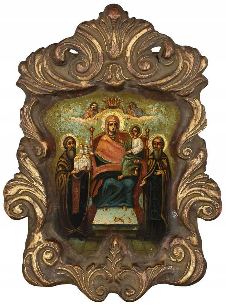 La Madre di Dio è rappresentata seduta sul trono d'oro con il Bambino Gesù che benedice con entrambe le mani. A destra si trova San Teodosio con il rotolo nella mano, e a sinistra - Sant'Antonij di Pechersk. Sul rotolo di Teodosio è scritto: "Signore, Signore Dio ... costruisci la casa della Tua Madre Immacolata con me, il tuo servo Teodosio, rinforzala fino al giorno del Tuo Giudizio in lode e gloria a Te". Sul rotolo di Sant'Antonio si legge: "Vi prego, figli, asteniamoci e non siamo pigri; in questo abbiamo l'aiuto dal Signore".