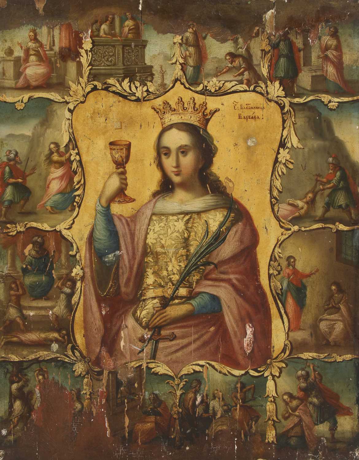 Nell'iconografia ucraina è presente fin dall'XI secolo (negli affreschi di Santa Sofia a Kyiv), ma divenne particolarmente popolare all'inizio del XVIII secolo. Le sue immagini erano molto popolari nell'iconografia popolare del XIX secolo, specialmente nell'Ucraina centrale e orientale. Le sue immagini erano quasi in ogni casa, perché la santa era considerata la patrona delle donne e delle ricamatrici. Di particolare interesse in questo periodo è l'icona "Decapitazione di Santa Barbara", sulla quale vediamo la testa mozzata della grande martire su un piatto d'argento. Questa trama deriva chiaramente da una rappresentazione simile della testa mozzata di Giovanni Battista.