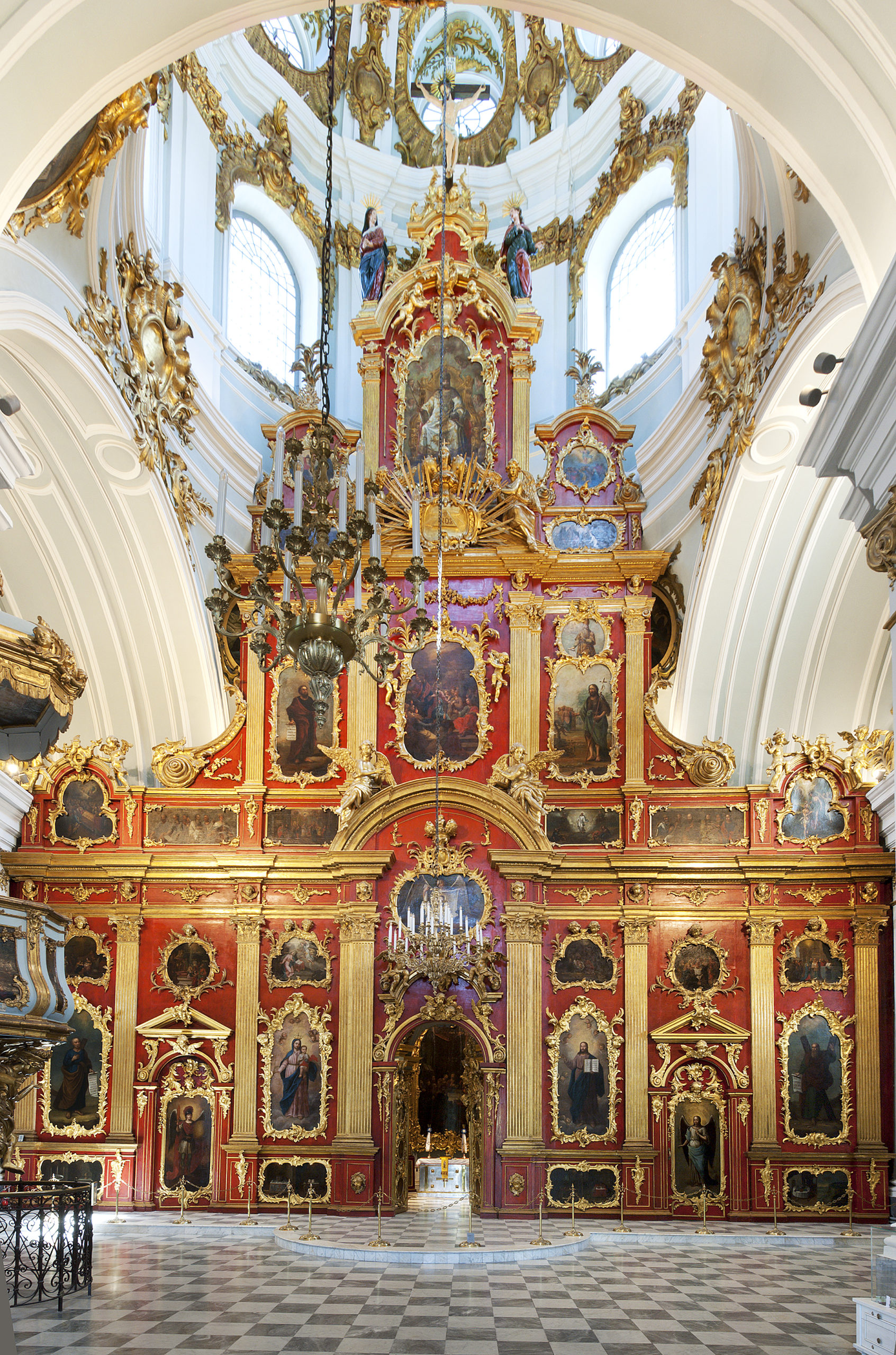 L'interno della chiesa è uno spazio a navata centrale, privo di colonne, in cui sono chiaramente visibili la pianta cruciforme dell'edificio, la suddivisione architettonica delle pareti con lesene, cornici e aperture delle finestre. I bracci della croce sono coperti da volte e il passaggio alla navata è reso possibile dagli archi di imposta e dalle vele della chiesa. L'insieme armonioso degli elementi artistici, quali architettura, scultura, intaglio e pittura, si combina e si completa a vicenda.